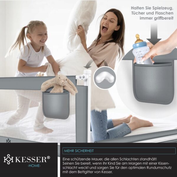 Większość małych dzieci śpi bardzo niespokojnie w nocy. Gdy dzieci dorosną z wieku dziecięcego, nasza siatka ochronna łóżka jest świetną alternatywą dla konwencjonalnych łóżeczek. Przymocuj poręcze łóżka dziecięcego do boku normalnego łóżka. Nasze kratki bezpieczeństwa zapobiegają wypadnięciu dziecka, a tym samym chronią je przed obrażeniami. Nasze kraty do spania są całkowicie elastyczne i dlatego idealnie nadają się do podróży, ponieważ wymagają mniej miejsca niż konwencjonalne łóżko podróżne.