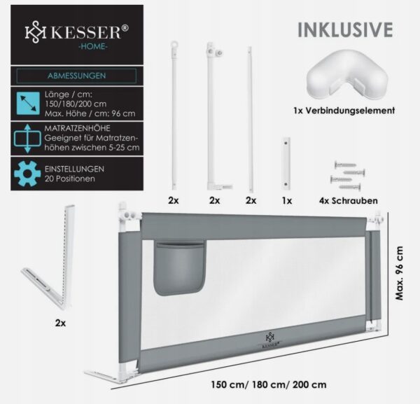 KESSER Barierka Ochronna na Łóżko – Osłona Zabezpieczająca 200 x 44 x 72-96 cm