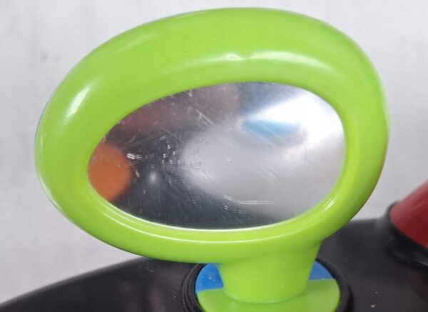 • Wyposażony w kierownicę z klaksonem, efekty świetlne i dźwiękowe oraz lusterka boczne.
