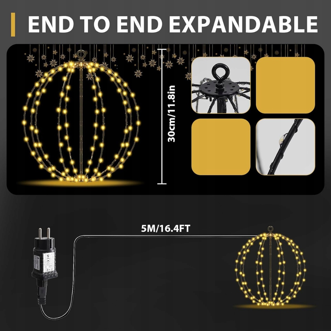 Projekt kuli o średnicy 30 cm wyposażony w 120 LED-ów tworzy ciepłą i romantyczną atmosferę podczas Twoich świątecznych przyjęć. Rozświetl drzewa, ogrody, werandy, tarasy, kawiarnie lub każdy pokój w swoim domu za pomocą tych uroczych świateł.
