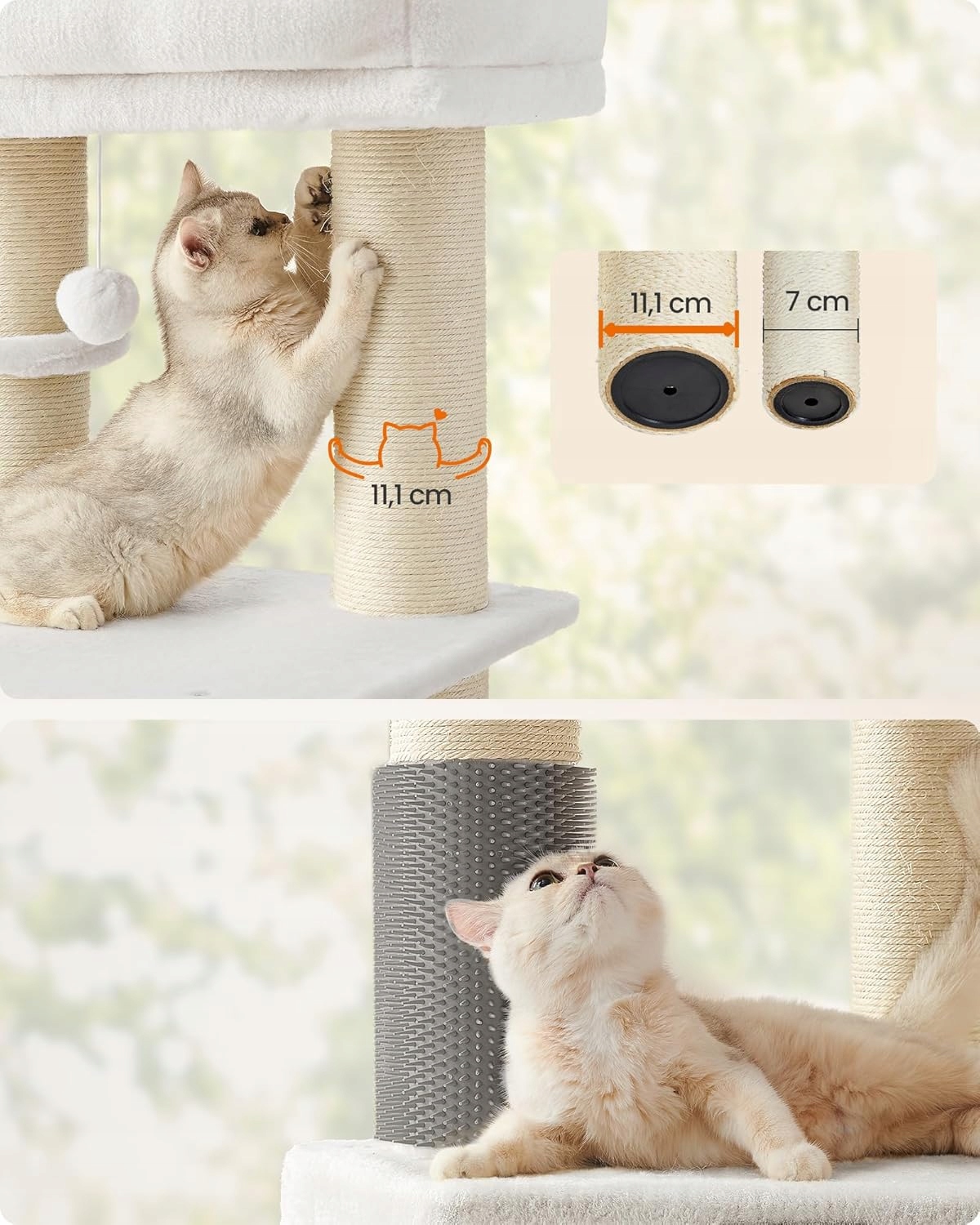 Dodatkowe elementy, takie jak hamaki, szczotki do pielęgnacji i wisząca zabawka, gwarantują kotu rozrywkę nawet podczas Twojej nieobecności. Stabilna konstrukcja z grubymi słupkami i wzmocnioną podstawą zapewnia bezpieczeństwo podczas intensywnej zabawy.