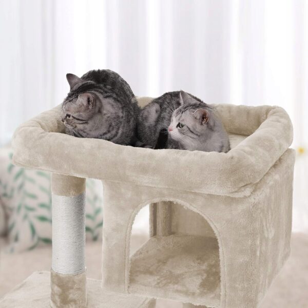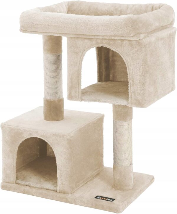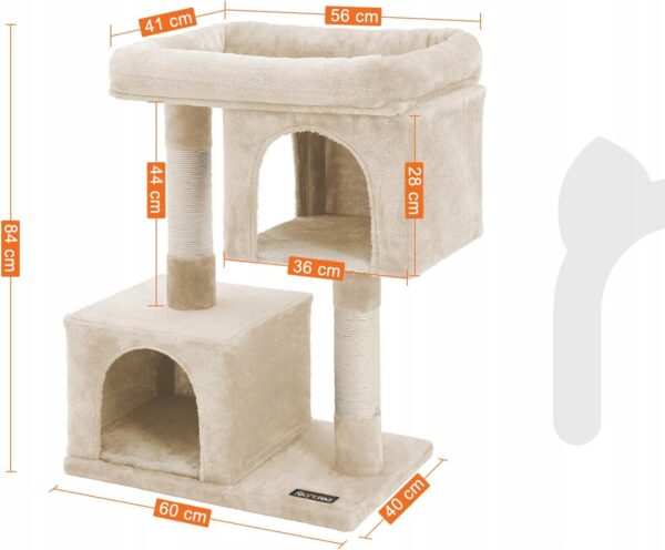 Duża górna platforma z miękkim pluszem to idealne miejsce do obserwacji otoczenia i drzemek. Dwie przytulne budki zapewniają prywatną przestrzeń do odpoczynku, a słupki owinięte naturalnym sizalem pomagają zadbać o pazury i chronią Twoje meble.