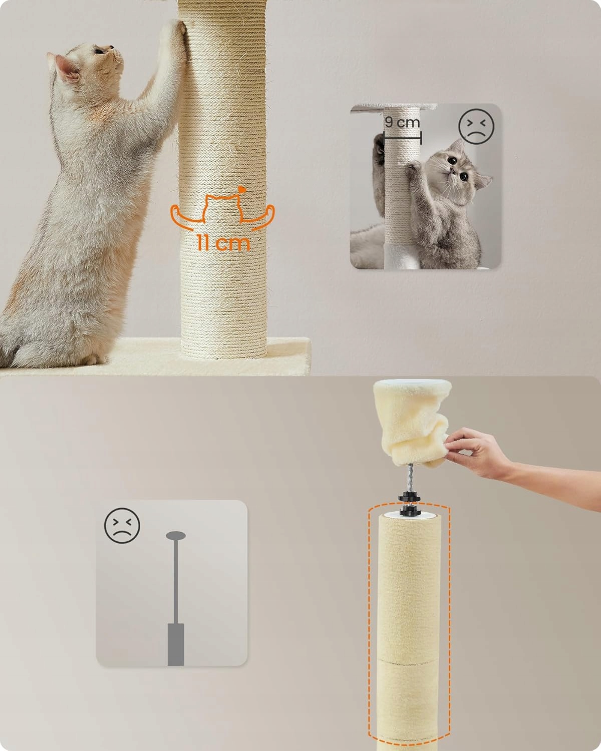 Wysoki, stabilny i wielopoziomowy drapak marki Feandrea to prawdziwy raj dla kotów. Regulacja wysokości aż do sufitu pozwala stworzyć imponującą przestrzeń do wspinaczki i odpoczynku – idealną dla domu z kilkoma kotami.