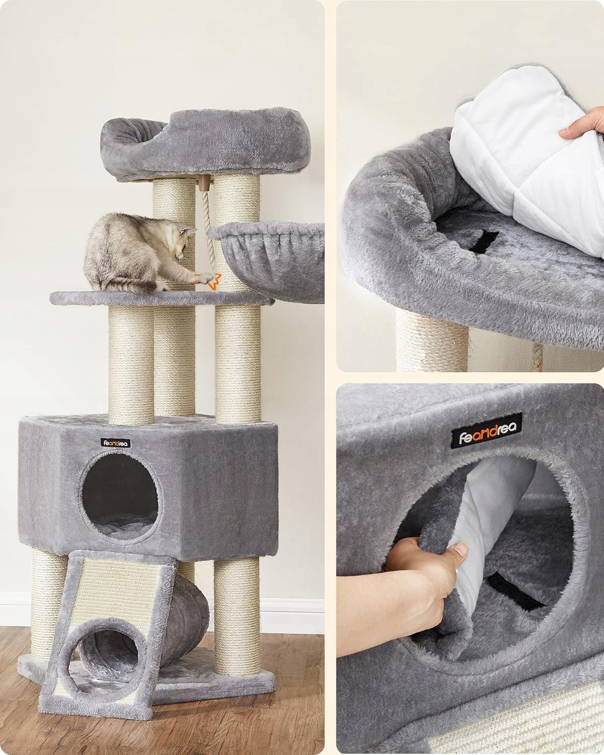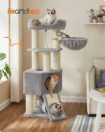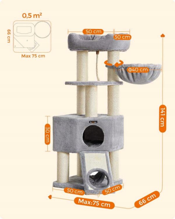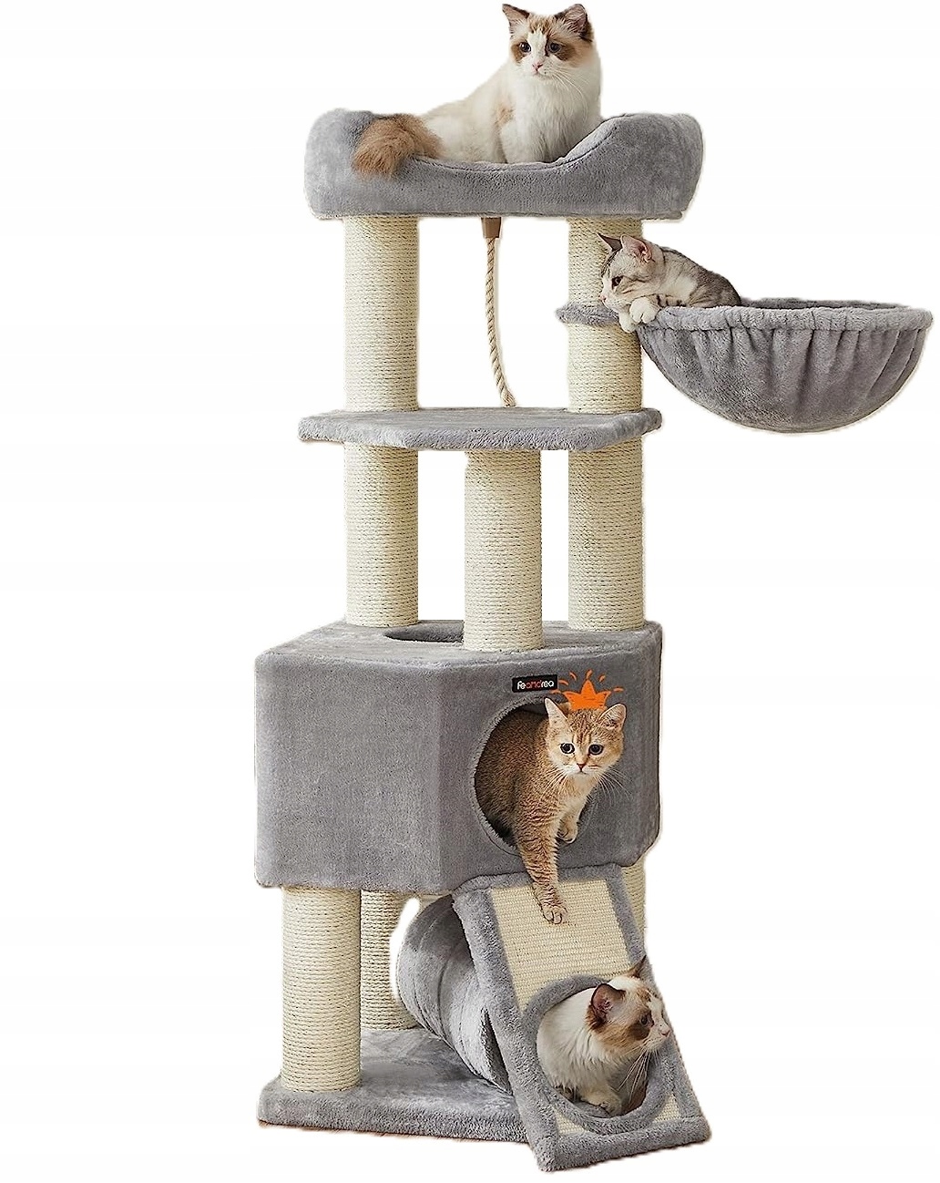 Wielopoziomowy luksusowy drapak FEANDREA LUXURY 141 cm zapewnia Twoim kotom zabawę, drapanie i relaks w jednym! Idealny dla wielu kotów, z tunelem, dużym domkiem, kubełkową leżanką i luksusowym legowiskiem. Stabilna konstrukcja z 8 słupami sizalowymi chroni meble, a miękkie pluszowe powierzchnie zapewniają komfort.