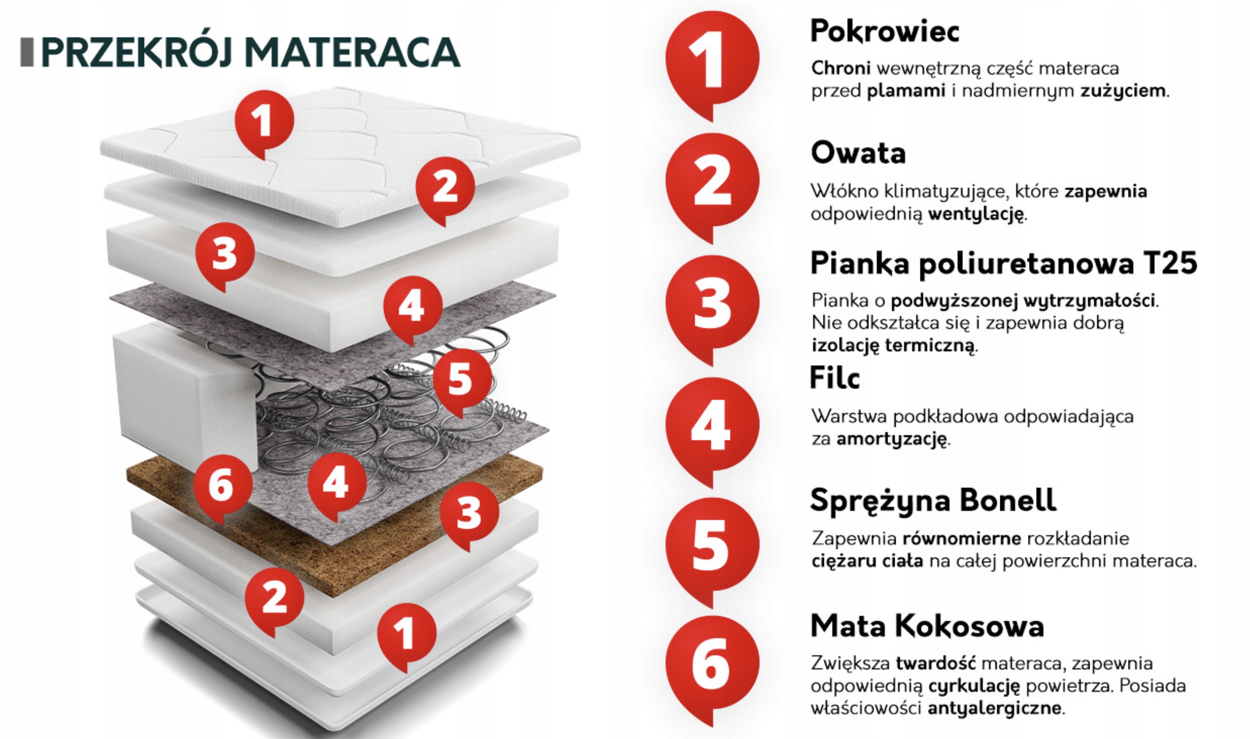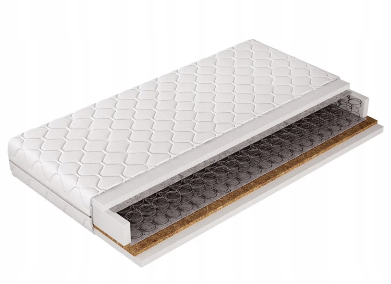 ✅ Wnętrze materaca wypełniają trwałe sprężyny bonellowe (112 sprężyn/m²), zapewniające stabilne podparcie dla ciała i wysoką odporność na odkształcenia. Z kolei warstwa pianki poliuretanowej odpowiada za wygodę i uczucie odprężenia w trakcie snu.