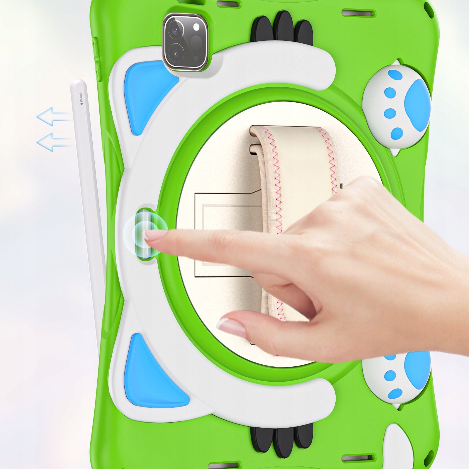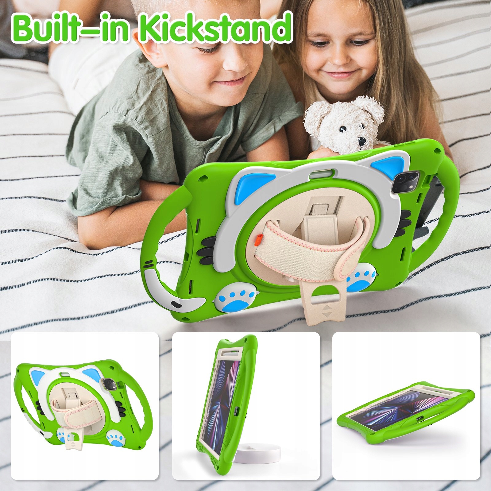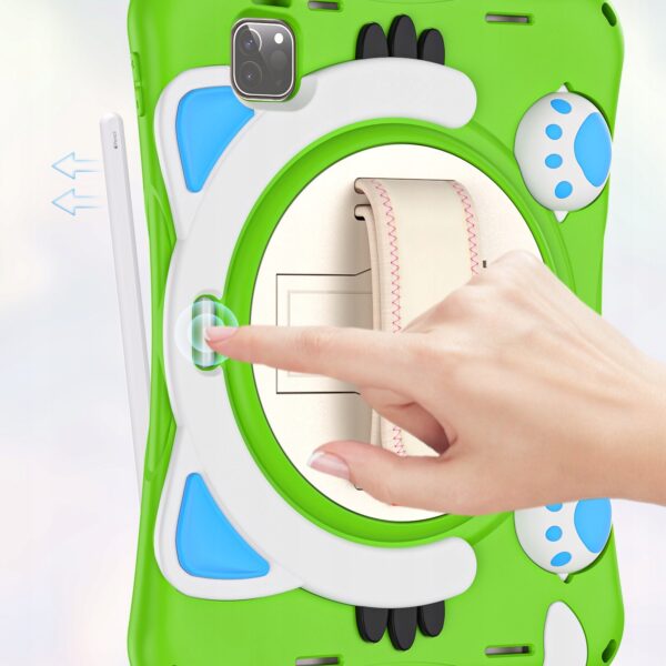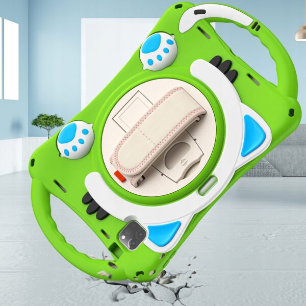 Wielofunkcyjna podpórka i uchwyt: Wbudowany obrotowy stół obrotowy o 360 stopni i składana podpórka, umożliwia regulację stojaka w celu uzyskania różnych kątów. Otwórz jako wygodny uchwyt do chwytania i przenoszenia. Uchwyty po obu stronach umożliwiają dzieciom łatwe i bezpieczne trzymanie tabletu.