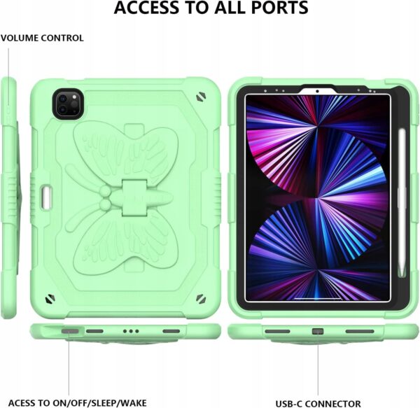 Unikalna podstawka z tyłu etui w formie motyla umożliwia wygodne ustawienie iPada w pozycji poziomej. Idealna do oglądania filmów, prowadzenia lekcji online, wideorozmów lub korzystania z aplikacji edukacyjnych i rozrywkowych.