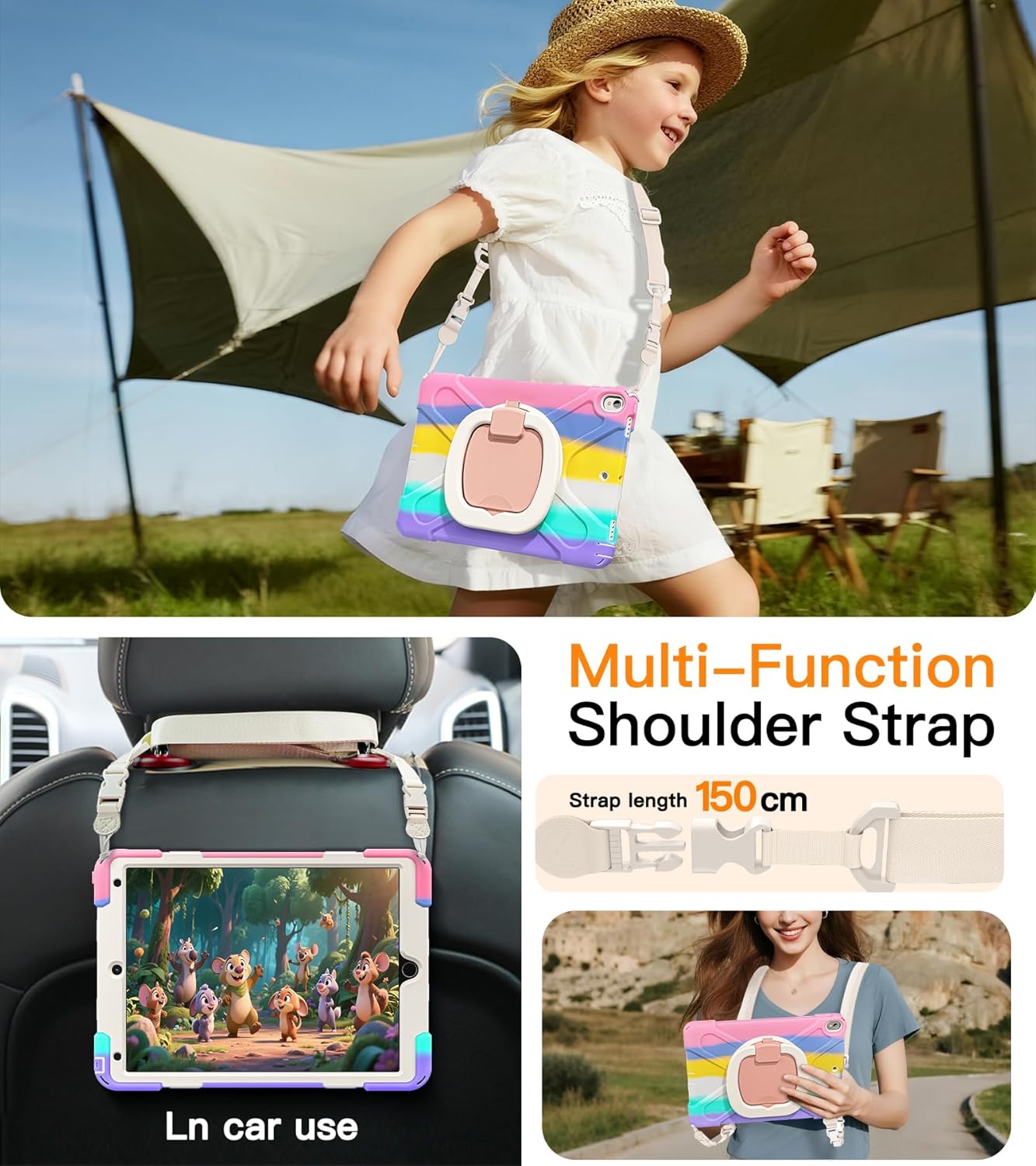 Odpinany i regulowany pasek na ramię pozwala na wygodne przenoszenie iPada – w pracy, w podróży lub na świeżym powietrzu. Umożliwia także zawieszenie tabletu np. na zagłówku fotela w samochodzie.