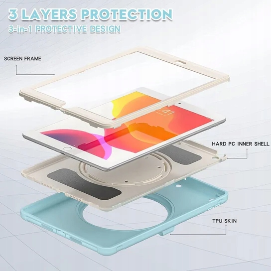 ✅ Wytrzymałe etui, które zapewnia kompleksową ochronę Twojego iPada 9/8/7 o przekątnej 10,2 cala. Konstrukcja składa się z trzech warstw – twardej obudowy z tworzywa PC oraz elastycznego, silikonowego wnętrza, które skutecznie amortyzuje wstrząsy i zabezpiecza urządzenie przed zarysowaniami oraz uszkodzeniami mechanicznymi.