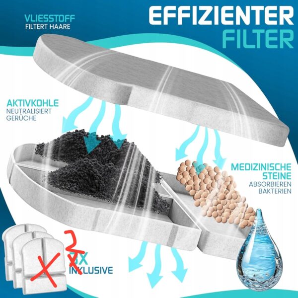 • Podwójny system filtracji – włóknina zatrzymuje sierść i większe zanieczyszczenia, węgiel aktywny usuwa nieprzyjemne zapachy, a kamienie mineralne wspierają eliminację bakterii.