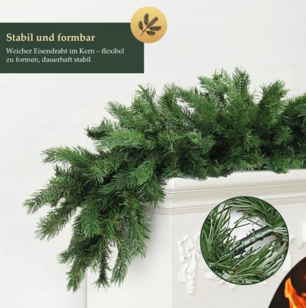 Dzięki zastosowaniu dwóch rodzajów materiałów – okrągłych gałązek PE oraz gęstych, wewnętrznych igieł PVC – girlanda wygląda jak żywa. Głęboka, naturalna zieleń oraz gęste ułożenie gałązek sprawiają, że dekoracja prezentuje się elegancko i efektownie zarówno w dzień, jak i przy świątecznym oświetleniu.