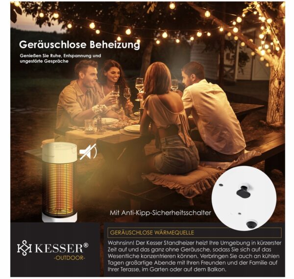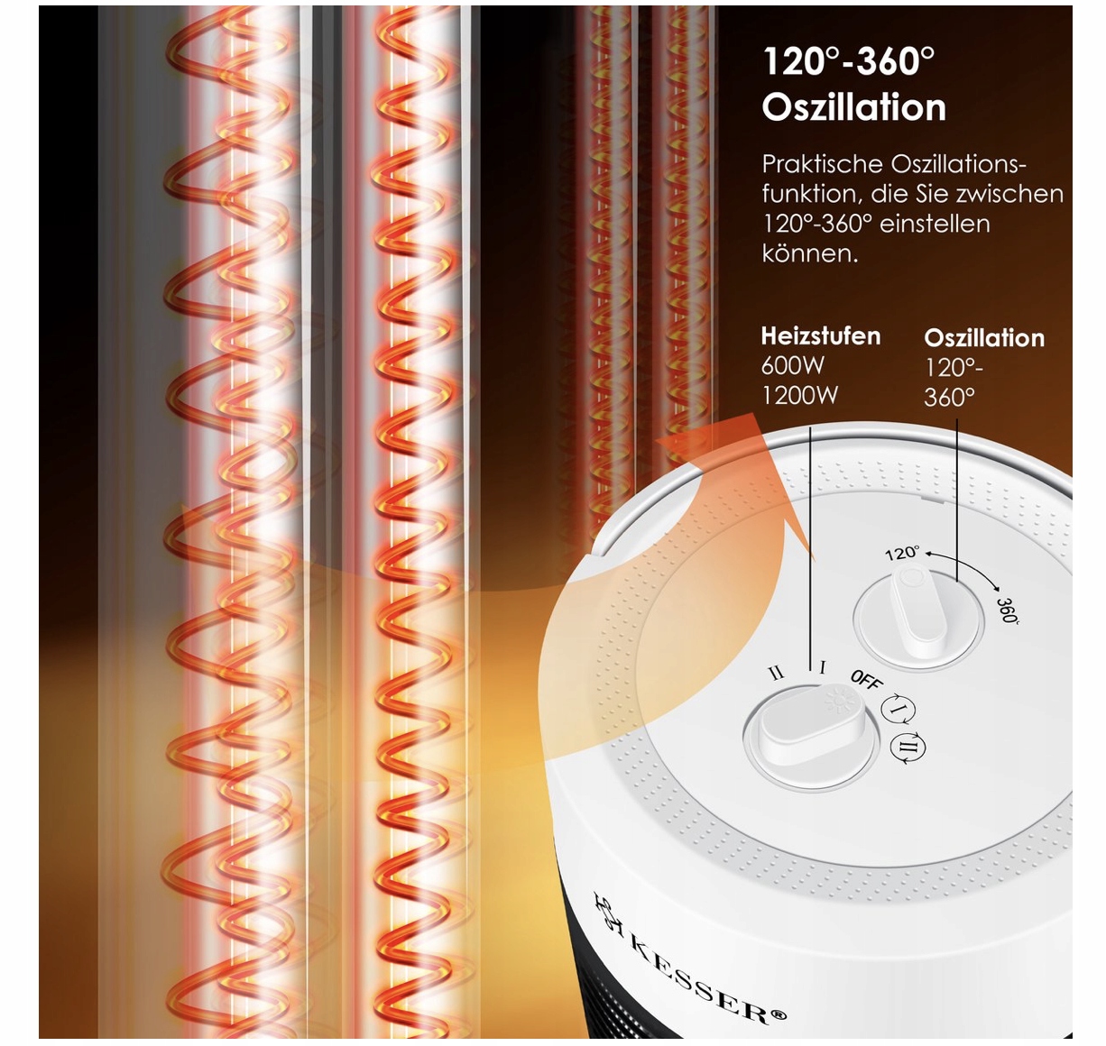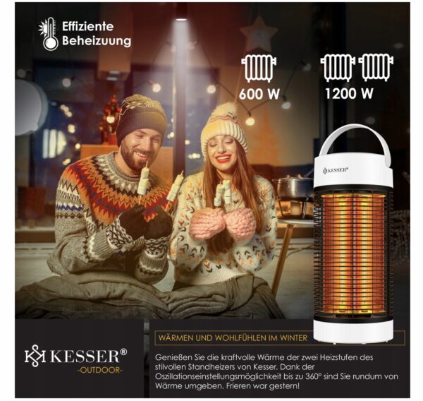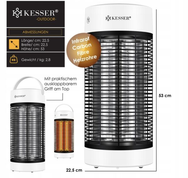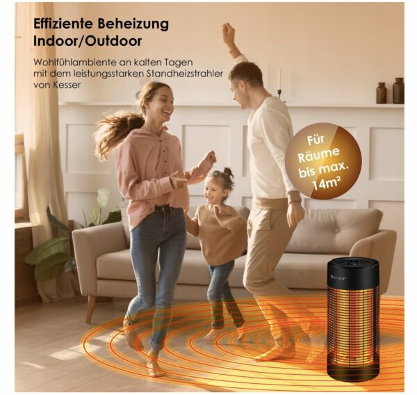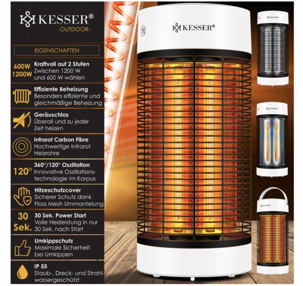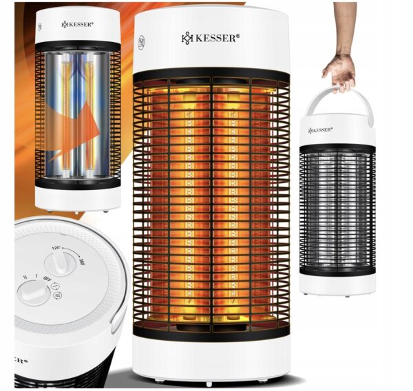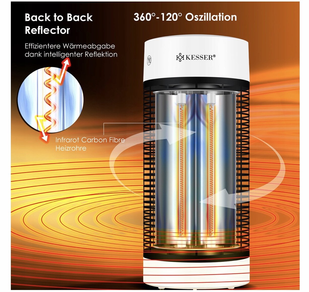KESSER Grzejnik na podczerwień – z dwoma mocnymi trybami grzewczymi dla efektywnego i równomiernego ogrzewania. Dzięki wysokiej jakości rurkom grzewczym na podczerwień, oscylacji w zakresie 120°-360°, cichej pracy oraz osłonie chroniącej przed gorącem, osiąga pełną moc grzewczą w zaledwie 30 sekund. Wyposażony w zabezpieczenie przed przewróceniem i ochronę IP55.