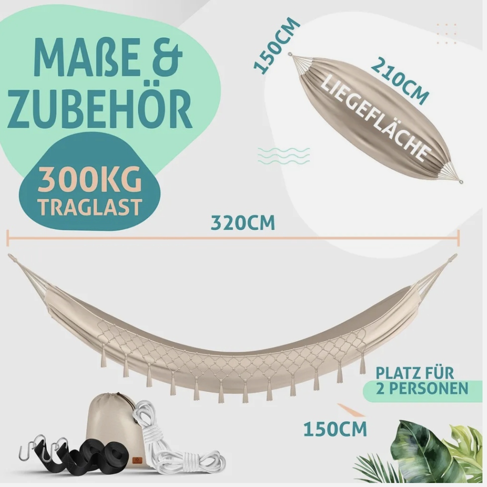 ✅ Wykonany z miękkiej mieszanki bawełny i poliestru, hamak jest przyjemny w dotyku, oddychający i odporny na warunki atmosferyczne. W połączeniu z wytrzymałymi linami i hakami montażowymi zapewnia stabilność i bezpieczeństwo użytkowania – nawet przy maksymalnym obciążeniu do 300 kg. Duża powierzchnia do leżenia (200 × 150 cm) pozwala na wygodny wypoczynek dla jednej lub dwóch osób.