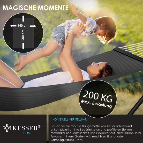 Stwórz swoją własną strefę relaksu w ogrodzie, na tarasie lub balkonie z hamakiem KESSER ze stelażem. To wygodne i stylowe rozwiązanie, które nie wymaga montażu między drzewami czy ścianami – dzięki solidnej stalowej ramie możesz ustawić hamak dokładnie tam, gdzie chcesz. Idealny do odpoczynku, czytania czy nawet krótkiej drzemki na świeżym powietrzu.