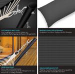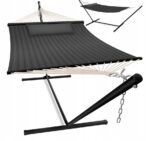 Wytrzymała konstrukcja stalowa zapewnia stabilność i bezpieczeństwo. Zawieszenie z solidnymi haczykami i linami umożliwia szybki montaż i demontaż. Materiał odporny na wilgoć sprawia, że hamak sprawdzi się również przy zmiennej pogodzie – po deszczu wystarczy go osuszyć i jest gotowy do dalszego użytku.