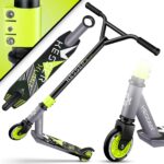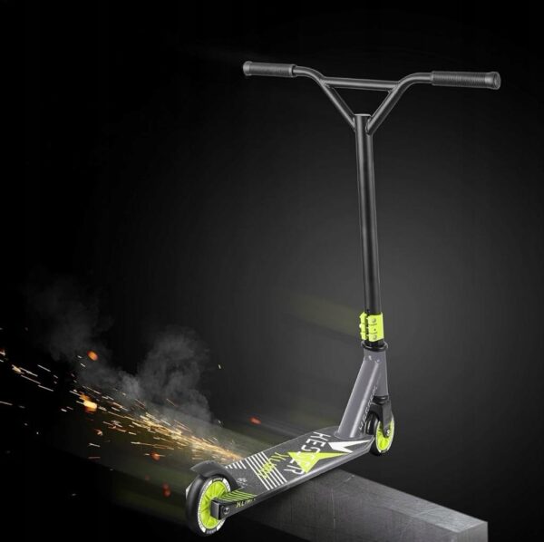 Dzięki obrotowemu o 360° kierownicemu drążkowi typu T oraz lekkiej aluminiowej konstrukcji, hulajnoga umożliwia wykonywanie precyzyjnych ruchów, skrętów i trików. Rzeźbione stalowe widelce CNC oraz system kompresji IHC zapewniają stabilność podczas jazdy i skoków, a wytrzymała platforma z antypoślizgową powierzchnią zwiększa bezpieczeństwo użytkownika.