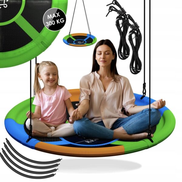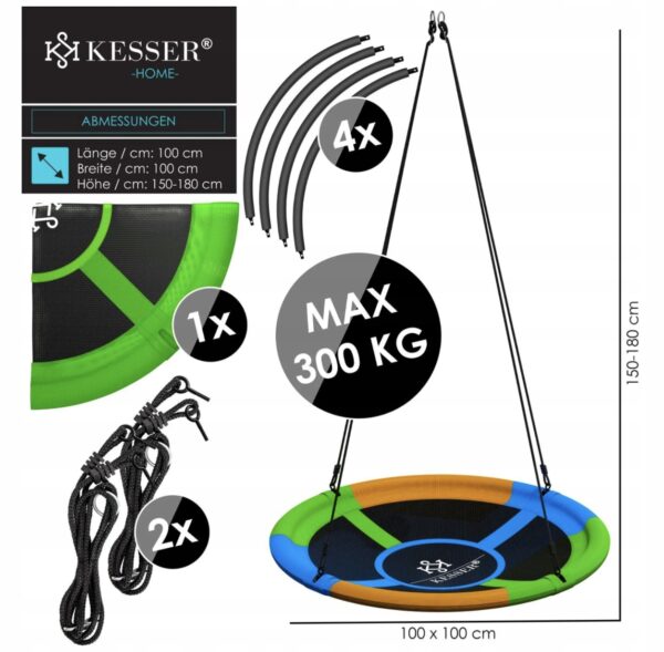 Okrągła huśtawka dla dzieci KESSER – wyjątkowa stabilność dzięki grubym linom PE, wysokiej wytrzymałości dzięki materiałowi Textilene, odpowiednia do użytku wewnętrznego i zewnętrznego, bezpieczna piankowa osłona, odporność na wodę i promieniowanie UV.