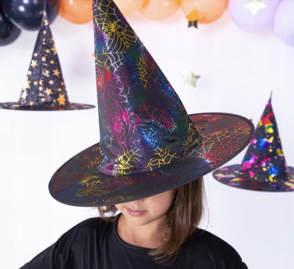 Na tym kapeluszu pająki uprzędły magiczne, kolorowe błyszczące pajęczyny. Ich wielobarwność dodatkowo podkreśla czarne tło tkaniny. Bardzo ładny element przebrania  czarownicy, wyróżniający się na tle czarnej sukienki czy peleryny. To może być idealny pomysł na zabawę w Halloween czy karnawał.