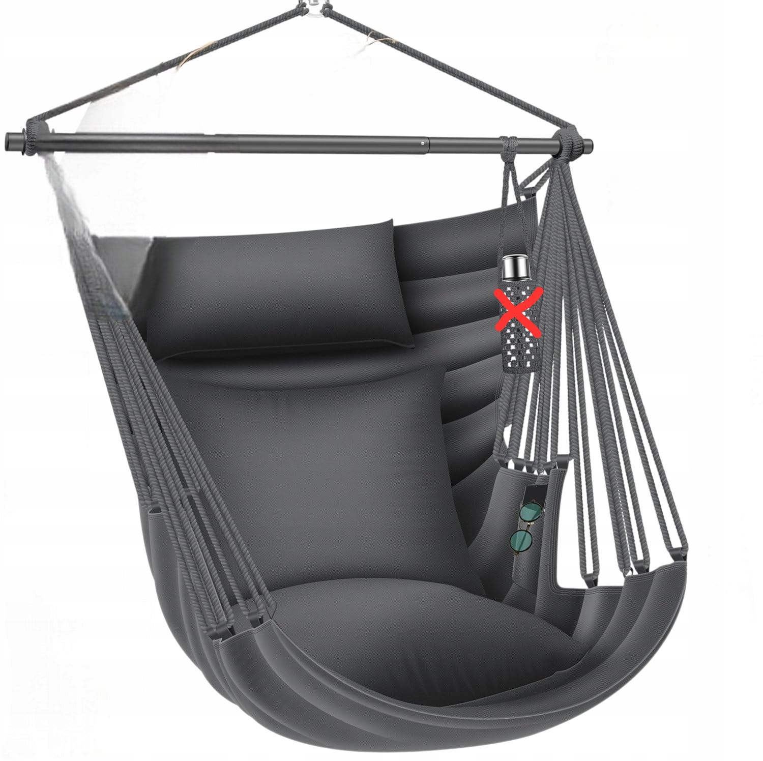 Wiszący fotel jest wyposażony w praktyczne kieszenie wewnętrzne, które zapewniają miejsce na Twoje rzeczy osobiste. Dodatkowo uchwyt na butelkę sprawia, że napój jest zawsze pod ręką.