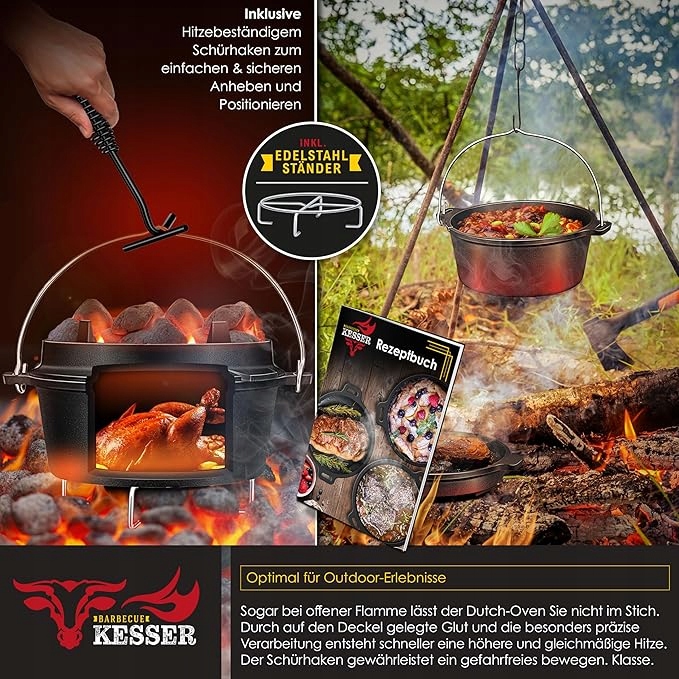 KESSER Premium Dutch Oven BBQ – wykonany z żeliwa, z hakiem żaroodpornym i pokrywką z uchwytem do przenoszenia.