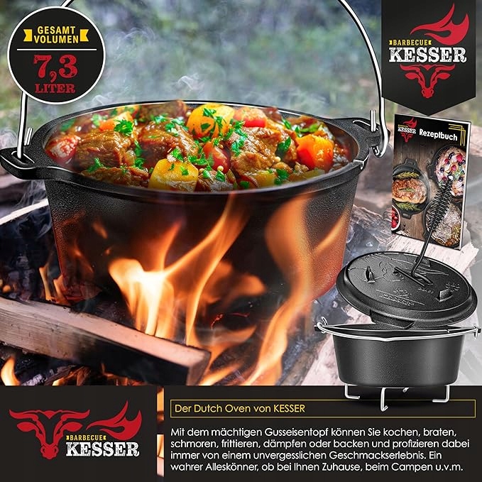 KESSER® Żeliwny garnek do piekarnika holenderskiego z pokrywką do grillowania na zewnątrz i wewnątrz Wielofunkcyjny zestaw do gotowania – Patelnia do grilla – Zapiekanka dla 4-8 osób z nóżkami 7,3l
