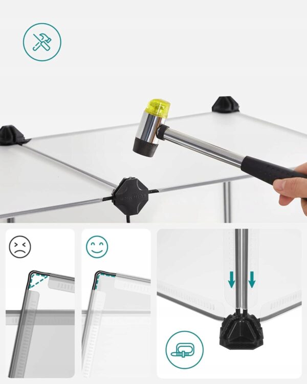 Montaż jest szybki i prosty – w zestawie znajdziesz 27 złączek, 30 opasek zaciskowych oraz gumowy młotek dla większej stabilności konstrukcji. Możesz dostosować kształt do swojego wnętrza. W razie potrzeby istnieje możliwość połączenia dwóch zestawów, aby zwiększyć wysokość.