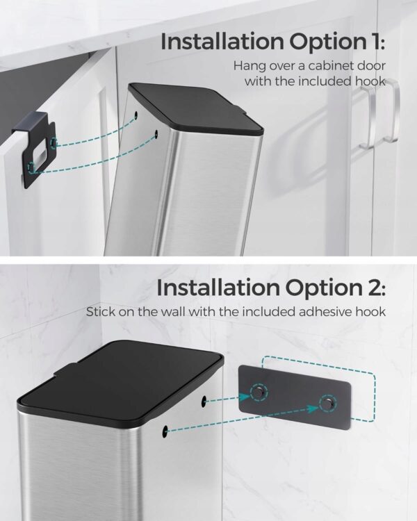 ✅ Kosz możesz zamontować na trzy sposoby: zawiesić na drzwiach szafki (do 2,5 cm grubości), przymocować do gładkiej ściany za pomocą haczyka samoprzylepnego lub postawić na blacie. Smukła konstrukcja sprawdzi się w kuchni, łazience, toalecie czy kamperze.