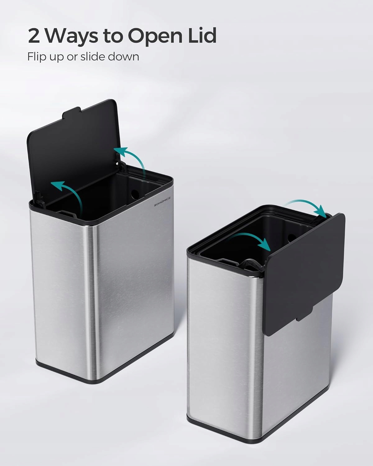 ✅ Pokrywę można otwierać na dwa sposoby – unosząc do góry lub zsuwając w dół, co ułatwia wyrzucanie odpadów podczas gotowania. Wyjmowany wewnętrzny pojemnik z uchwytami oraz otwory na worek pozwalają na szybkie opróżnianie i estetyczne ukrycie worka.