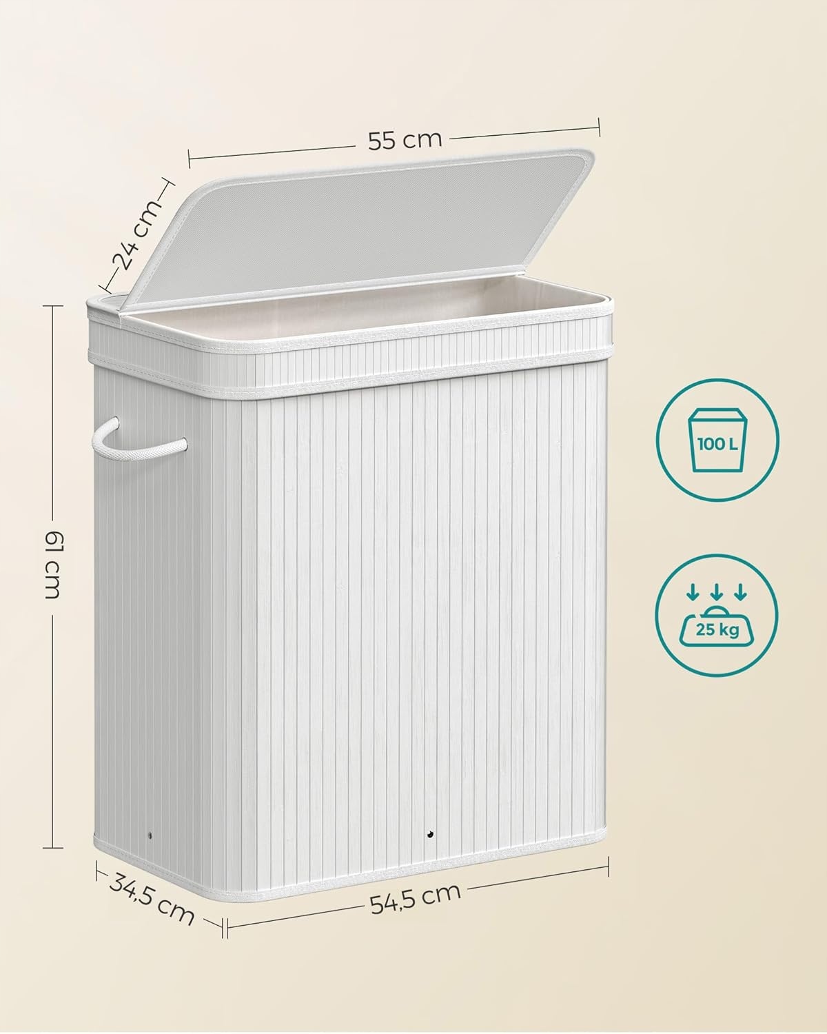Bambusowe lamele i metalowa rama zapewniają stabilność oraz wytrzymałość do 25 kg. Wyjmowany worek ułatwia przenoszenie brudnych ubrań do pralni i można go prać w pralce, aby zachować higienę.