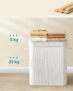 Bambusowe lamele i metalowa rama zapewniają stabilność oraz wytrzymałość do 25 kg. Wyjmowany worek ułatwia przenoszenie brudnych ubrań do pralni i można go prać w pralce, aby zachować higienę.