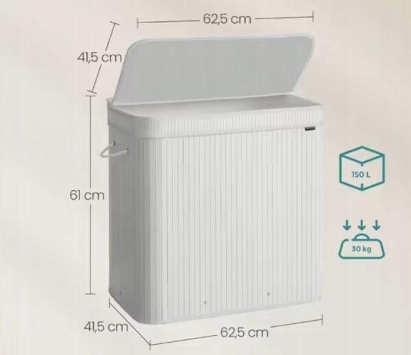 Nowoczesny kolor chmurno-biały i naturalny bambus sprawiają, że kosz doskonale pasuje do łazienki, sypialni, pralni czy garderoby.