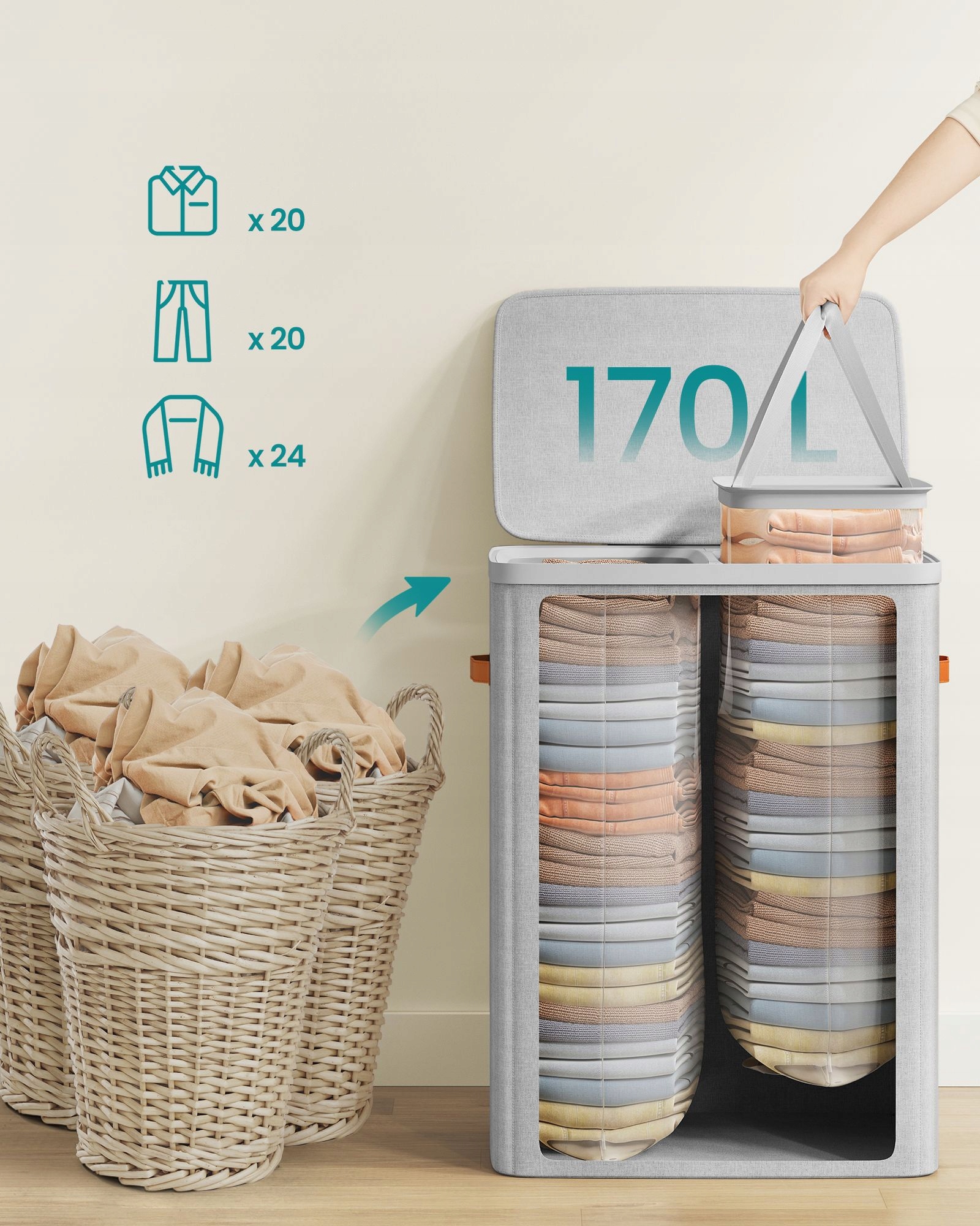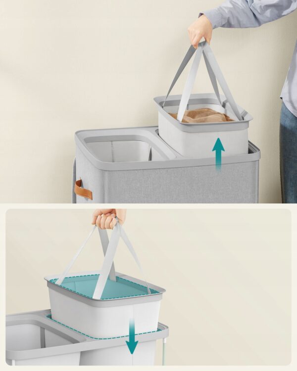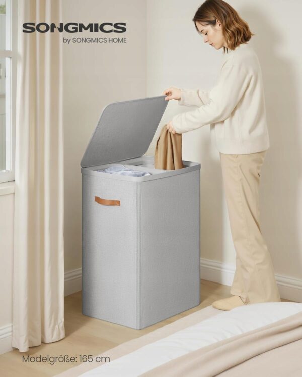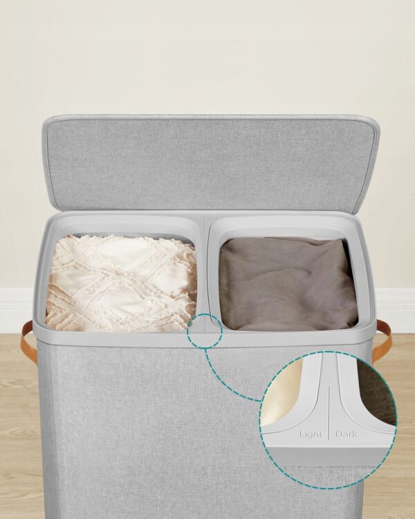 Duży i funkcjonalny kosz na pranie SONGMICS 170L to idealne rozwiązanie dla rodzin oraz osób, które cenią porządek i wygodne sortowanie ubrań. Dzięki dwóm oddzielnym przegrodom z oznaczeniami „Jasne” i „Ciemne” pranie możesz segregować na bieżąco.