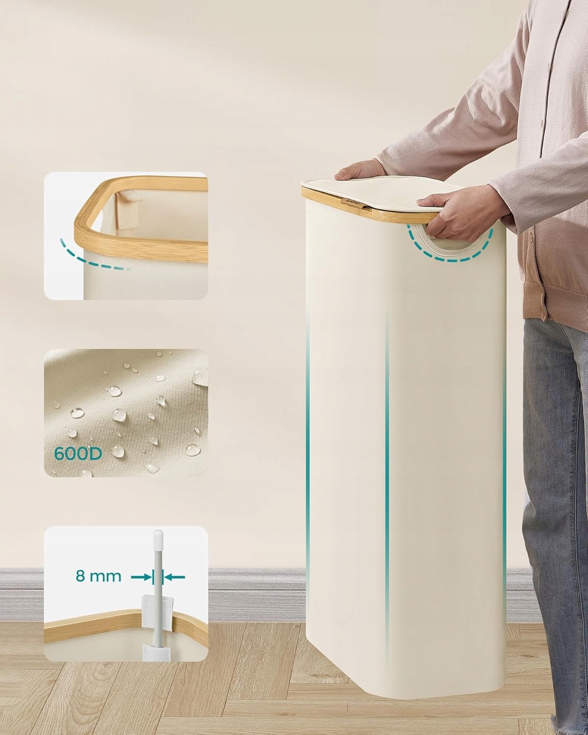 Nowoczesny, kremowobiały kolor oraz bambusowe uchwyty sprawiają, że kosz świetnie komponuje się z każdym wnętrzem.