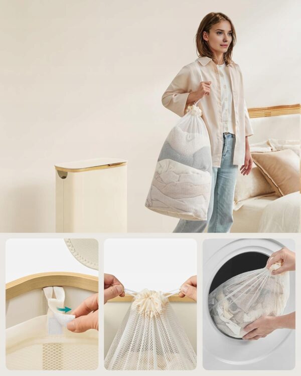 Funkcjonalny i elegancki kosz na pranie SONGMICS to idealne rozwiązanie do małych łazienek, pralni i wąskich wnęk. Smukła konstrukcja pozwala maksymalnie wykorzystać przestrzeń bez rezygnowania z dużej pojemności 65 litrów.