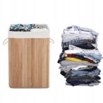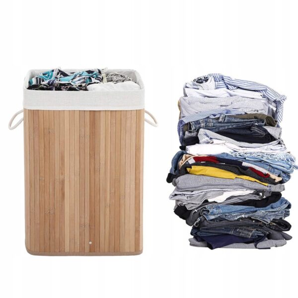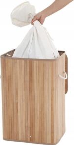 Duży kosz na pranie o pojemności 72 litrów łączy w sobie elegancję naturalnego bambusa i praktyczność. Pokrywa otwierana jedną ręką chroni przed kurzem i nieprzyjemnymi zapachami, a wyjmowana torba z polibawełny ułatwia przenoszenie i pranie ubrań.
