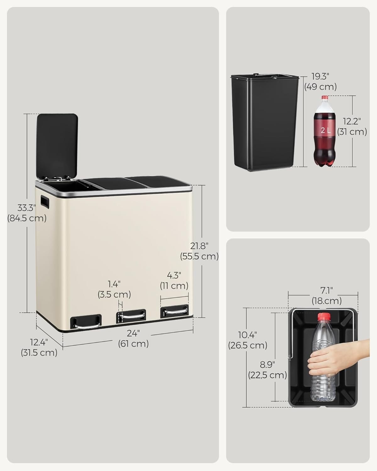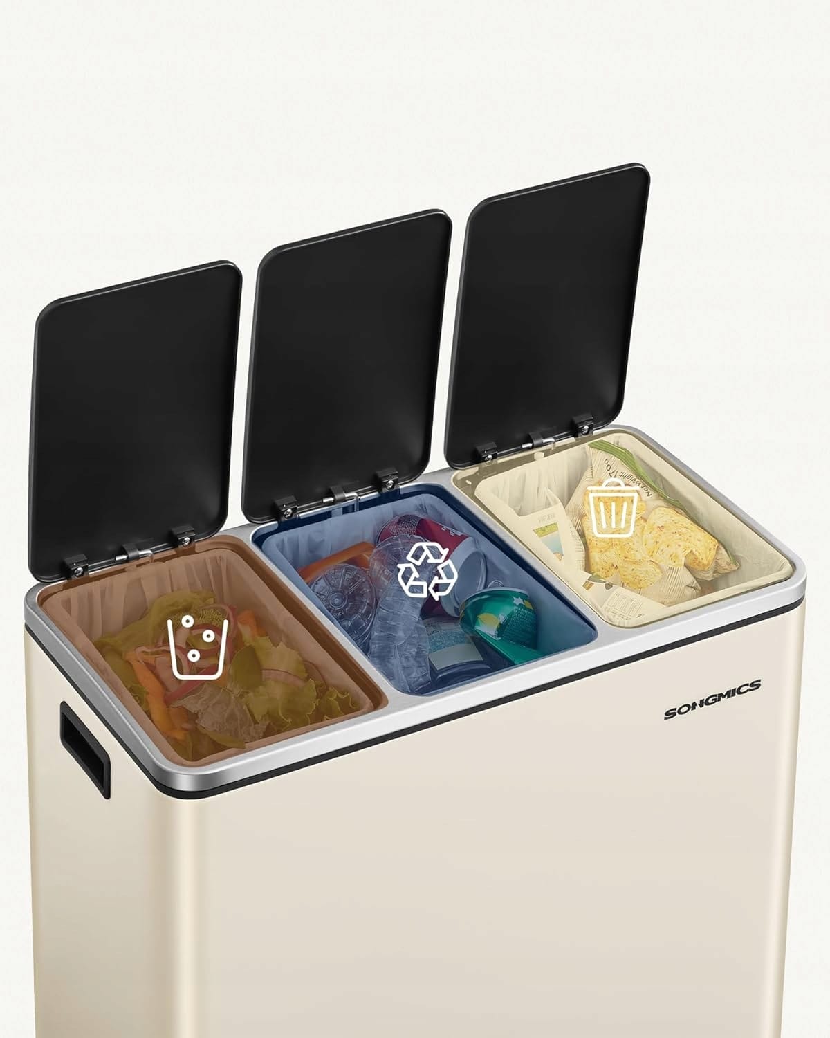 Zadbaj o wygodną i estetyczną segregację odpadów w swojej kuchni. Funkcjonalny kosz SONGMICS z trzema komorami pozwala łatwo oddzielić odpady bio, zmieszane i recykling – wszystko w jednym miejscu.