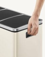 Dzięki pedałom otwieranie pokrywy jest higieniczne i bezdotykowe, a system cichego zamykania sprawia, że kosz działa płynnie i bez hałasu. Solidna stalowa obudowa jest odporna na rdzę i łatwa w czyszczeniu, a nowoczesny design w kolorze piaskowego beżu świetnie pasuje do każdej kuchni.