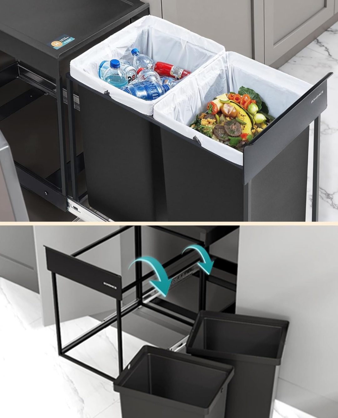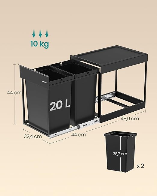 Utrzymaj kuchnię w porządku dzięki praktycznemu, wysuwanemu koszowi na śmieci SONGMICS. Dzięki 2 przegrodom i ukrytej konstrukcji odpady są łatwo segregowane, a przestrzeń w szafce maksymalnie wykorzystana.