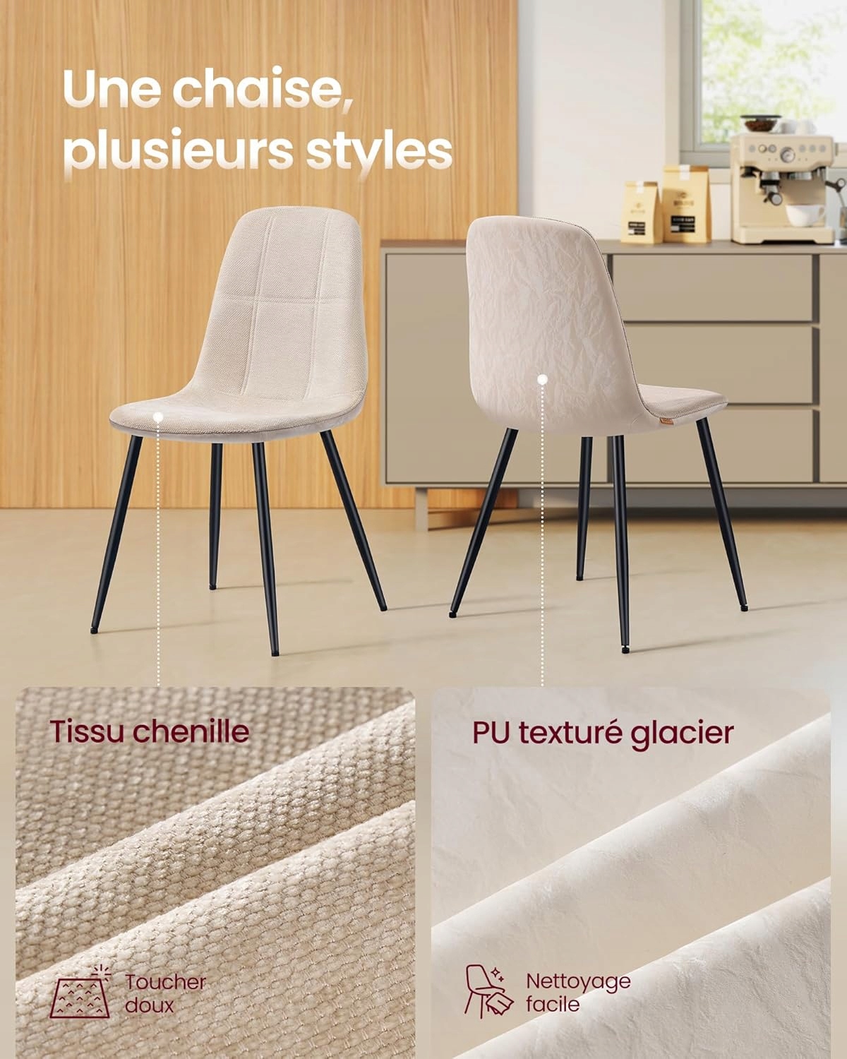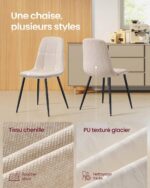 Zestaw 2 eleganckich krzeseł do jadalni VASAGLE to połączenie stylu, komfortu i trwałości. Przód siedziska został pokryty miękką tkaniną chenille, a tył wykonano z wysokiej jakości materiału PU o błyszczącej, teksturowanej powierzchni. Takie zestawienie materiałów nadaje krzesłom nowoczesny i elegancki wygląd.