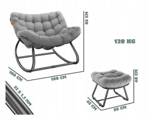 - Wymiary fotela: 100 x 100 x 85 cm (dł. x szer. x wys.)