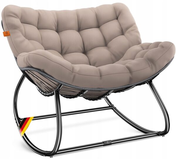 Ergonomiczny, wygodny i stylowy fotel bujany do wewnątrz i na zewnątrz. Idealny na relaks po długim dniu – odporny na warunki pogodowe, wytrzymały i stabilny, z miękką wyściółką, rattanowym wykończeniem i stalową ramą.