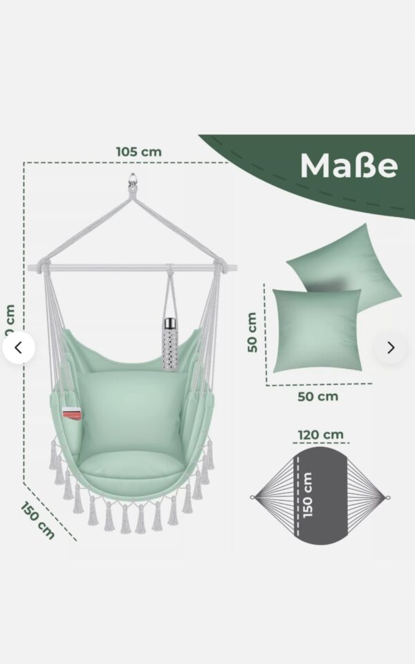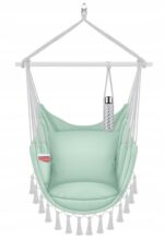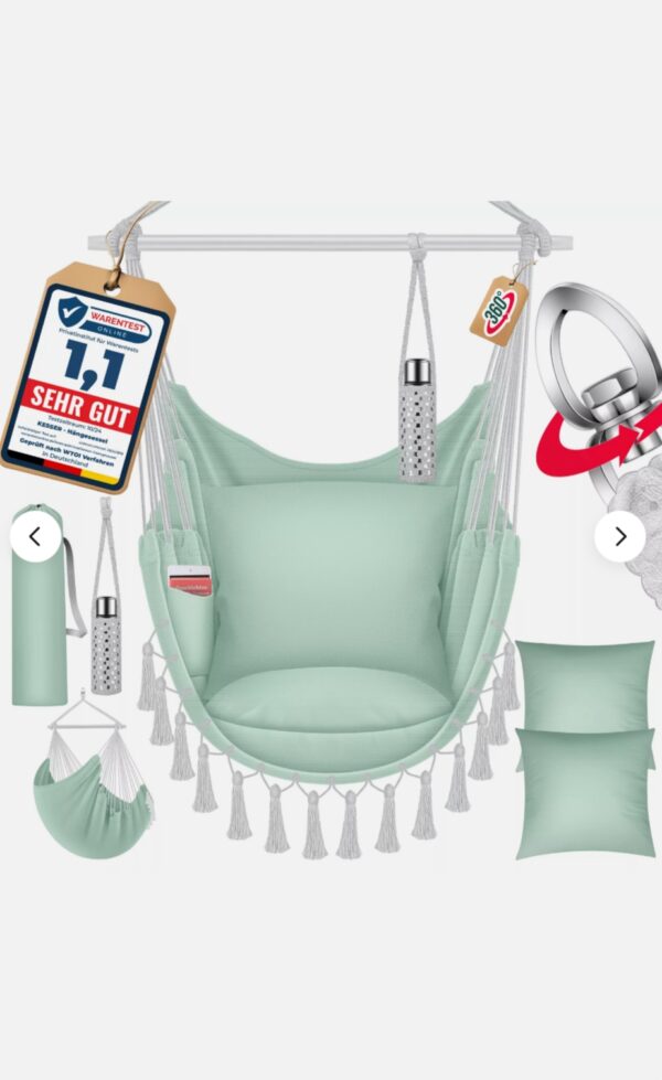 ✅ Fotel relaksacyjny jest wykonany z miękkiej bawełny oraz trwałego poliestru, a obrotowa zawiesia zapewnia komfort 360°. W połączeniu z wysokiej jakości i wytrzymałą rozpórką z drewna twardego, nasz fotel wiszący gwarantuje długą żywotność oraz maksymalną wytrzymałość do 150 kg.