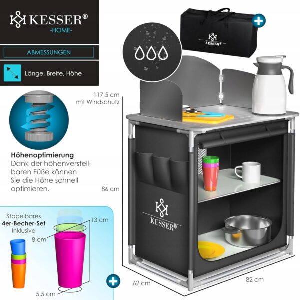 Praktyczna i funkcjonalna kuchnia kempingowa KESSER to idealne rozwiązanie dla miłośników podróży, biwakowania oraz aktywnego wypoczynku na świeżym powietrzu. Dzięki lekkiej, składanej konstrukcji, dużej ilości miejsca do przechowywania oraz odporności na warunki zewnętrzne, świetnie sprawdzi się nie tylko na kempingu, ale także w ogrodzie, na tarasie czy w domku letniskowym.