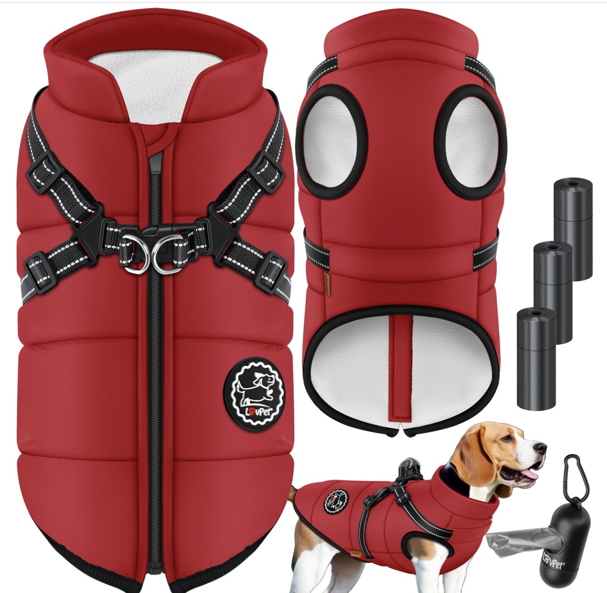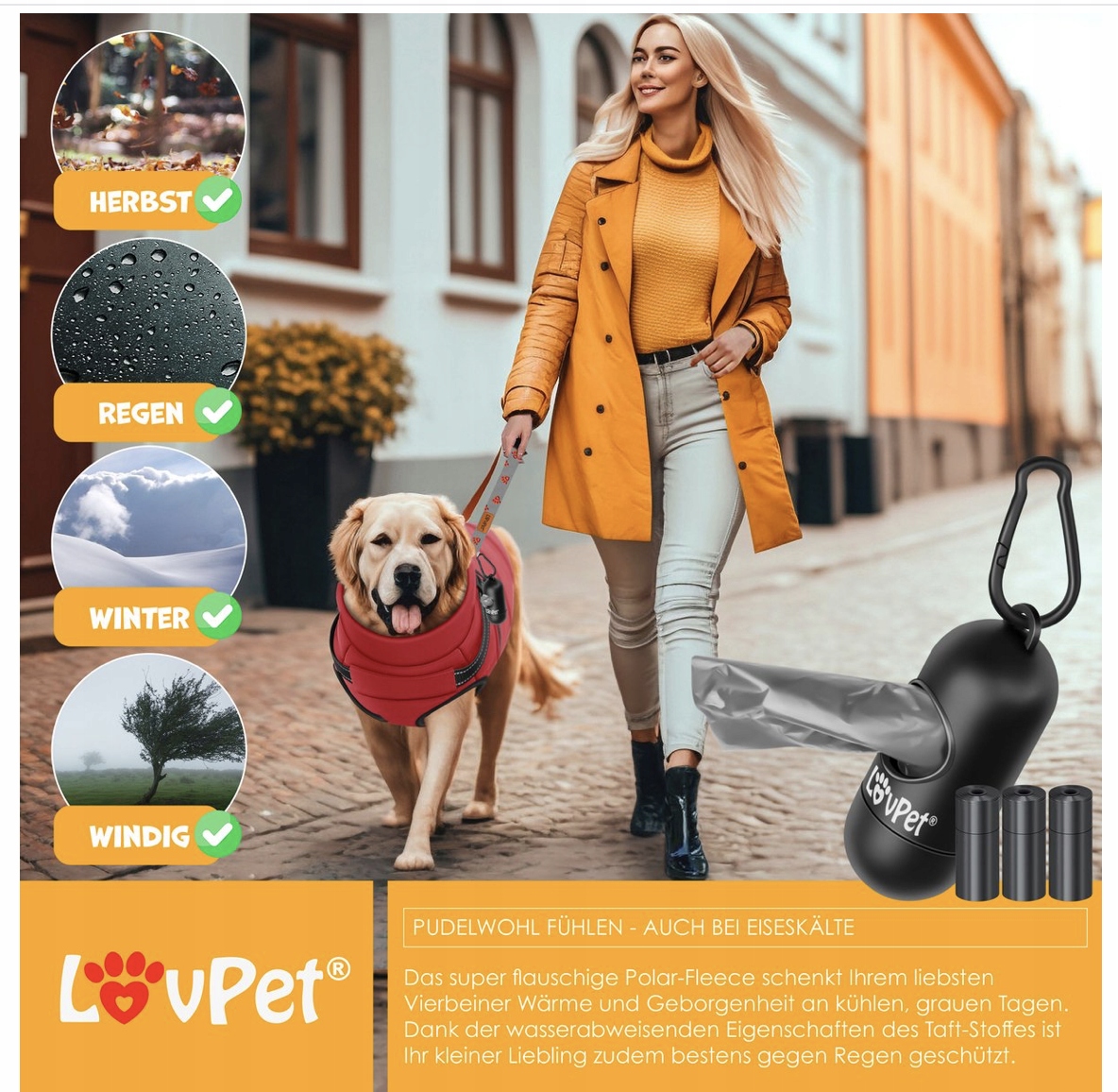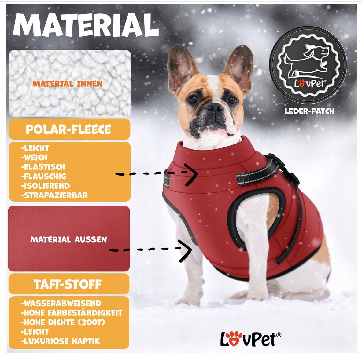 Kurtka dla psa LovPet wykonana z polaru i tafty, wodoodporna konstrukcja i mocne zapięcia, regulowana.