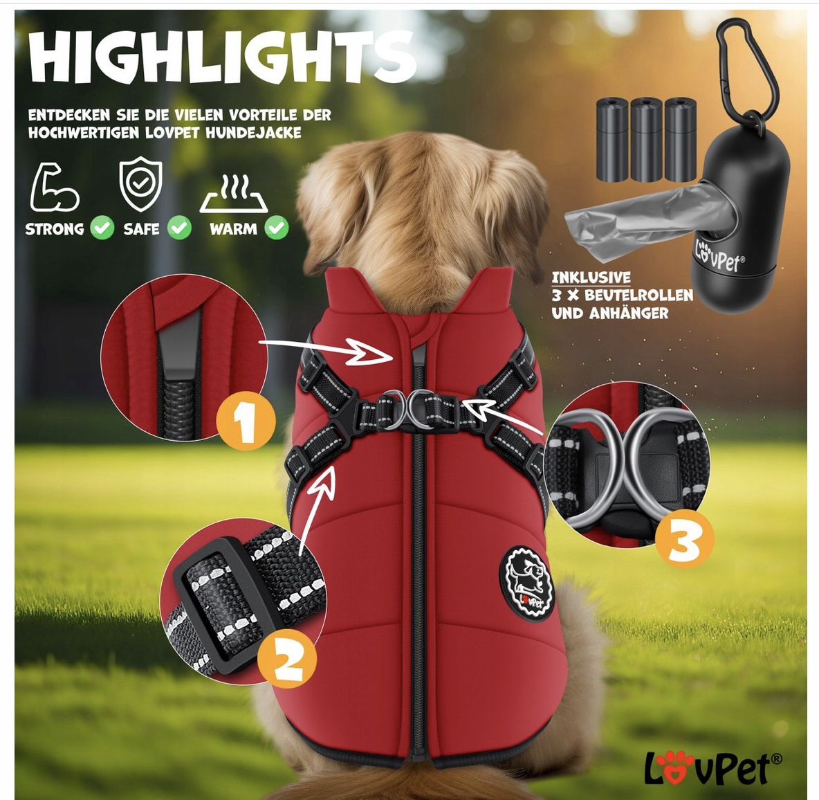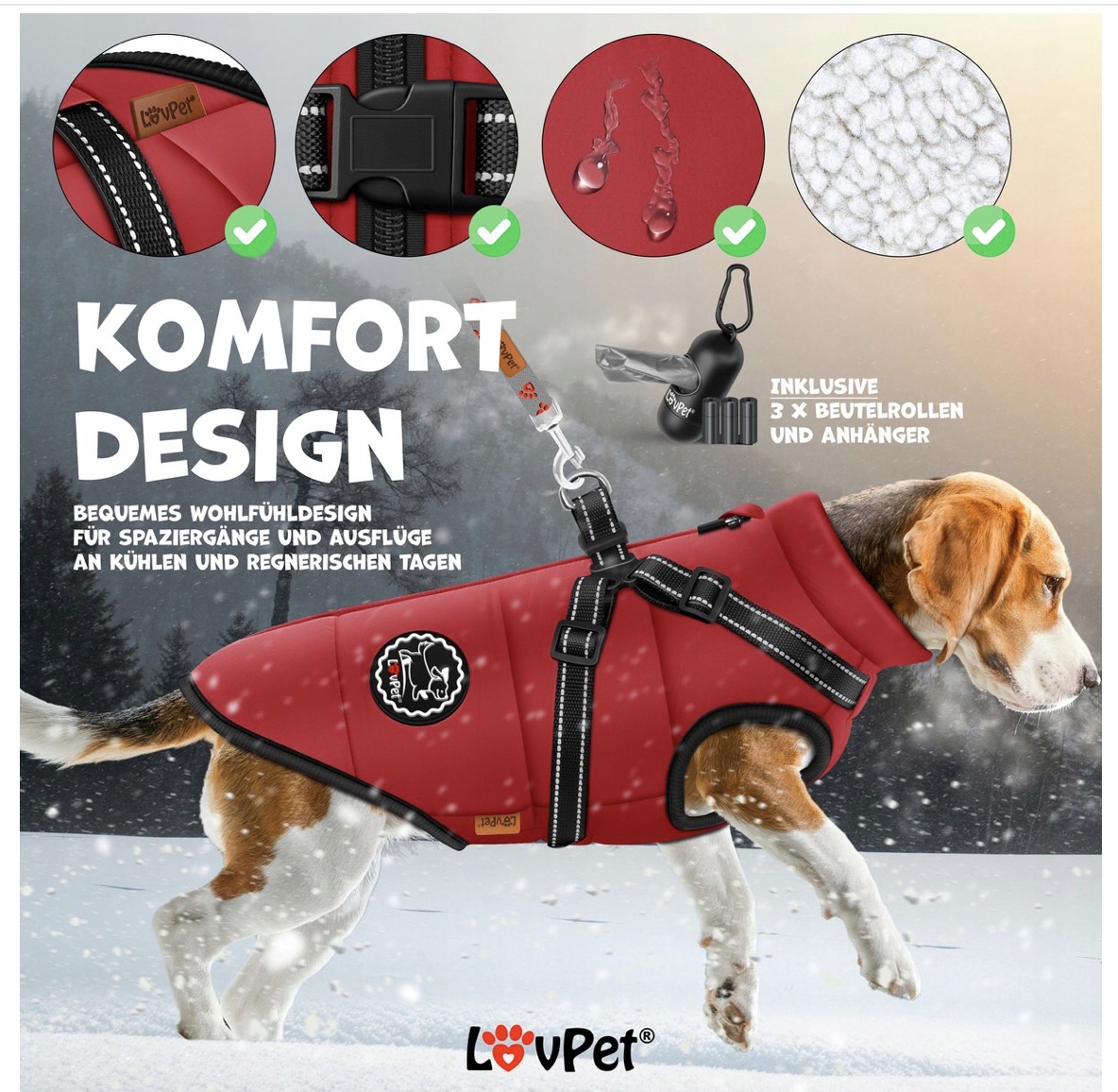 Kurtka dla psa LovPet wykonana z polaru i tafty, wodoodporna konstrukcja i mocne zapięcia, regulowana.