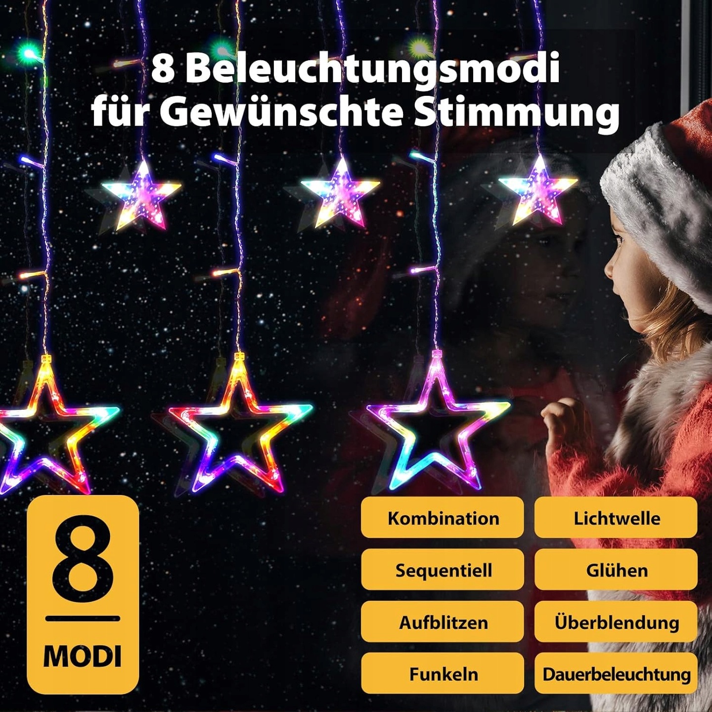 ⭐️ 138 małych punktów świetlnych (w gwiazdkach lub na łańcuszku) umieszczonych na 12 pasmach, każde pasmo posiada gwiazdkę. Łańcuch świetlny LED o długości 2 m i szerokości 1 m, przewód zasilający o długości 2 m (łącznie 4 m) ze standardową wtyczką UE 220 V, 3,5 W, z przezroczystym kablem.