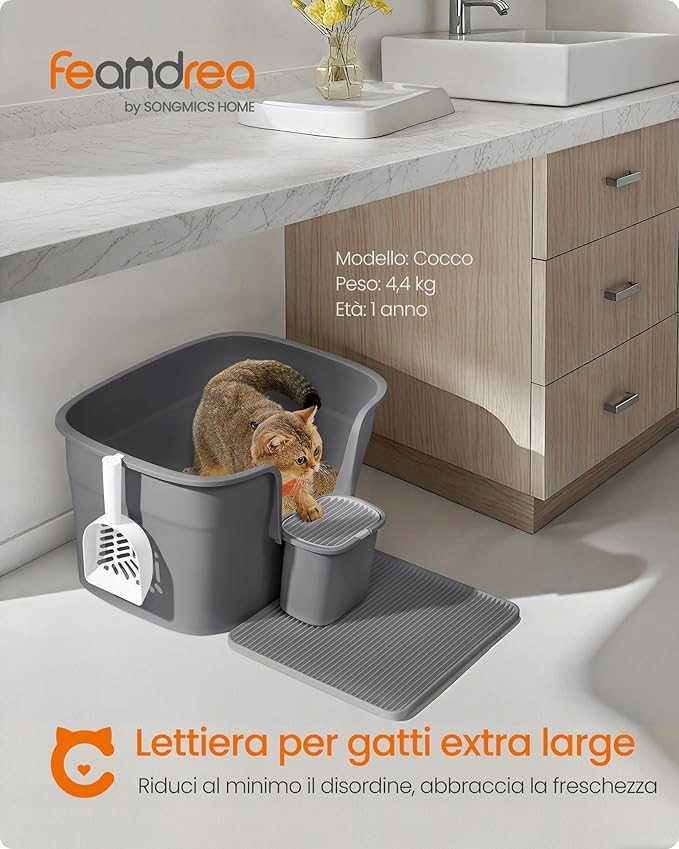 Ta duża, wysoka kuweta Feandrea zapewnia Twojemu pupilowi wygodę i prywatność, a Tobie łatwe utrzymanie czystości.