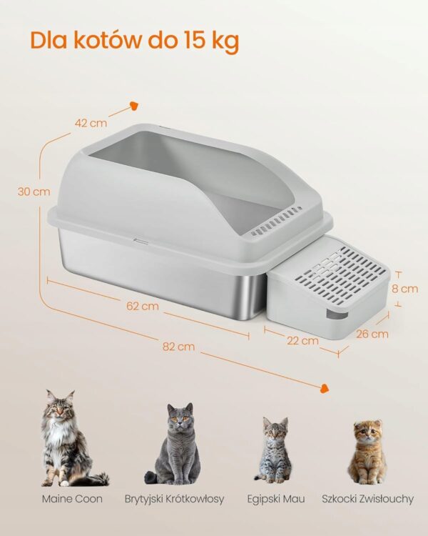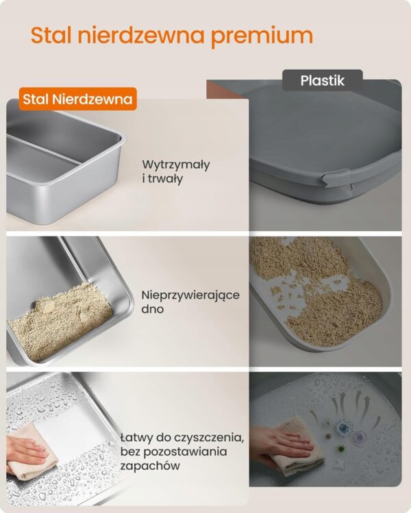 Postaw na higienę i wygodę swojego kota dzięki dużej kuwecie wykonanej ze stali nierdzewnej. Materiał odporny na zarysowania, plamy i zapachy sprawia, że codzienne utrzymanie czystości staje się znacznie prostsze.
