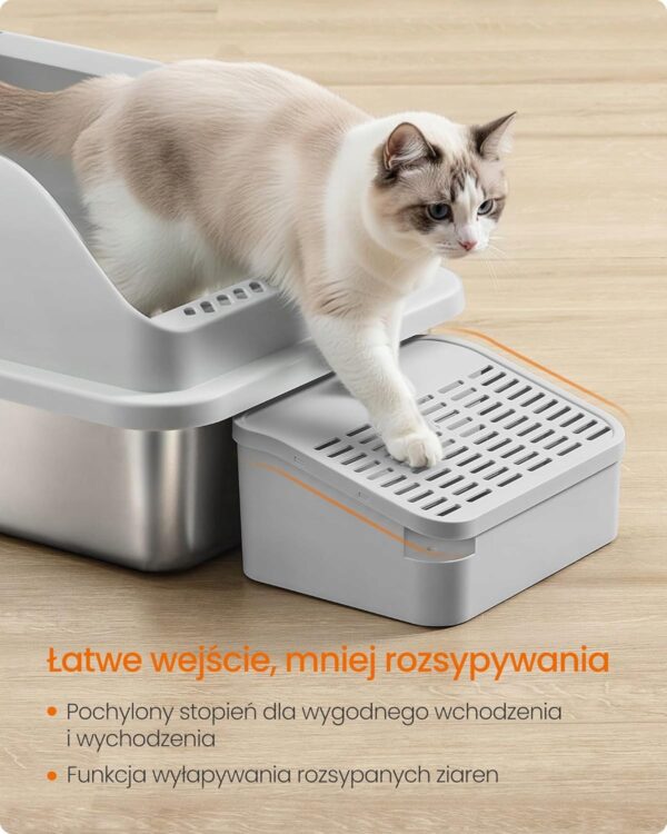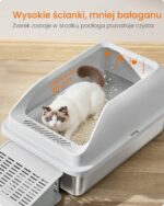 Wysokie boki skutecznie zapobiegają rozsypywaniu żwirku, a otwarta konstrukcja zapewnia dobrą cyrkulację powietrza i komfort dla pupila. Niskie wejście oraz praktyczny stopień ułatwiają korzystanie zarówno młodym, jak i starszym kotom.