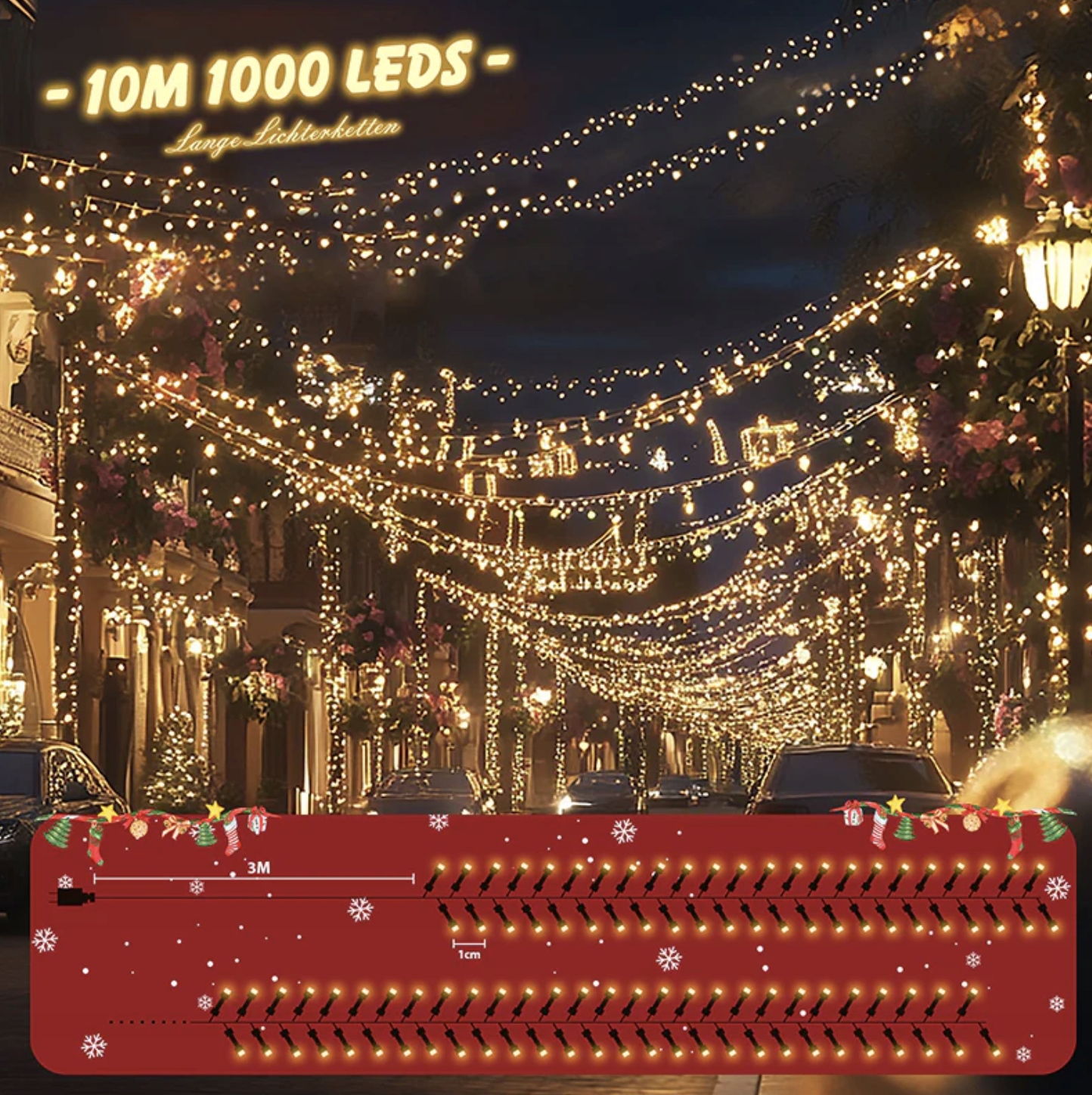⭐️ Długość całkowita 10m, przewód zasilający 3m, 1000LED, odstęp między lampkami 1 cm, napięcie 31V, ciepła biel. Idealna do dekoracji choinki.